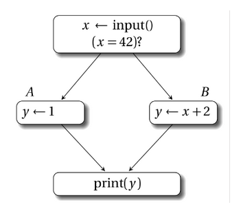 在分支汇总处,一个原始变量的取值会取决于数据从哪条分支上流入,上图AB块中的两个y我们称作y1和y2,print块中的y并非定义而是使用,那么它的取值便成了未知数,我们用y3 = phi [A, y1], [B, y2] 这条指令对y进行一次定义,y3成为此时y的唯一取值。
