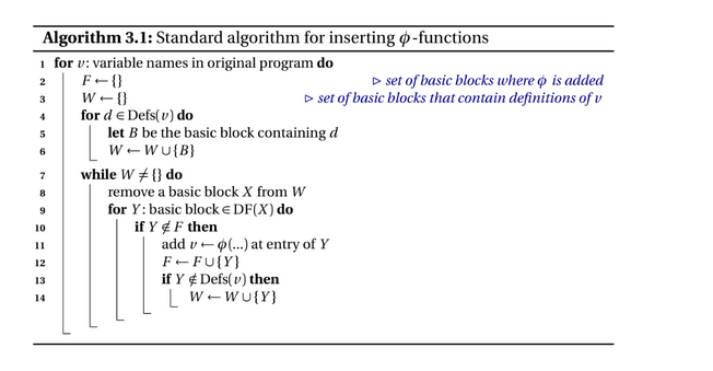 首先明确为何计算支配边界,一个节点的支配边界代表着支配范围的边界,在该节点对变量的定义会在边界处会产生歧义(即这个定义只是多个取值的可能一种取值),因此我们需要计算支配边界来找到插phi的位置。