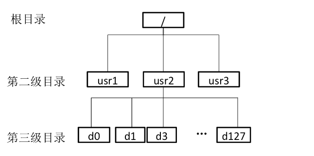 读取usr2目录的内容(即对应d0-d127的目录项)需读取1.5次磁盘:读取整个第三级目录所对应的目录项需要访问磁盘128/64=2次,因此平均需要读取(1+2)/2=1.5次。