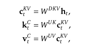 MLA: 将K和V进行低秩联合压缩,以减少KV缓存,类似LoRA。将KV以低维度缓存,使用时再通过投影层变换回去。减少内存占用的同时丢失部分精度。