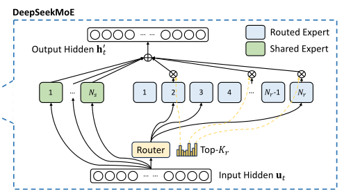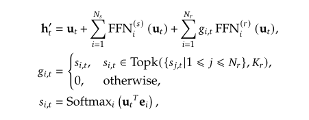 - 路由专家:在$Nr$个路由专家中选取$Top_k$个亲和度最高的专家激活,并计算每个激活专家归一化后的权重$g{i,t}$,将输出按权重分配相加。